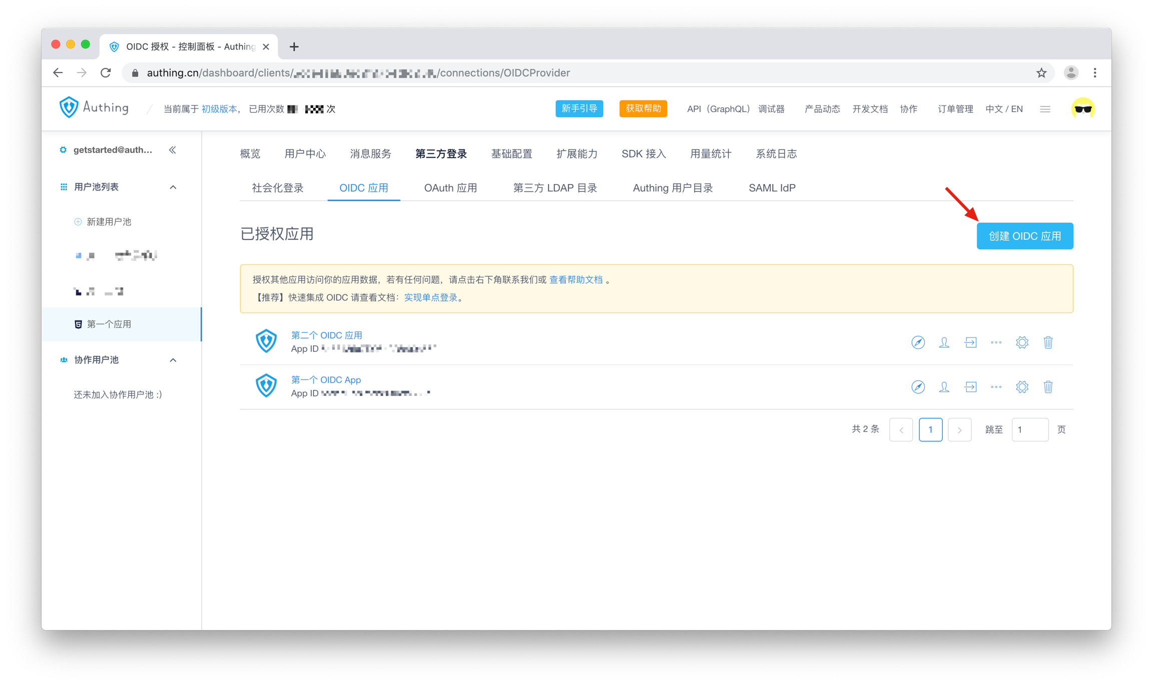 进入控制台 > 第三方登录 > OIDC 应用,点击「创建 OIDC 应用」按钮。