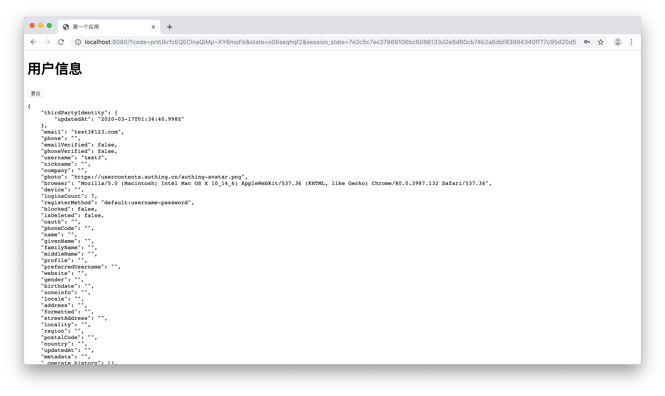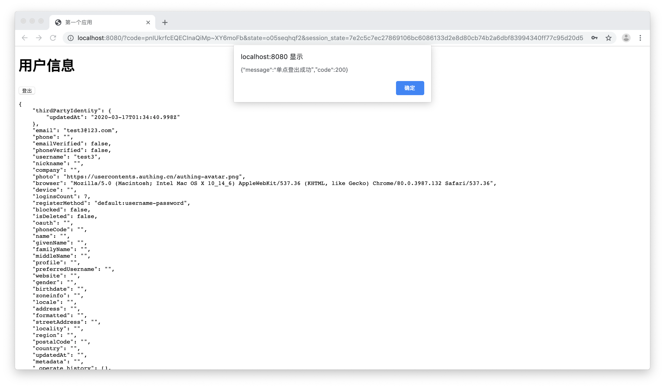 你可以在这个页面多刷新几次,因为当前是已登录状态,浏览器会一直显示用户信息。接下来,我们点击「登出」按钮,进行单点登出。